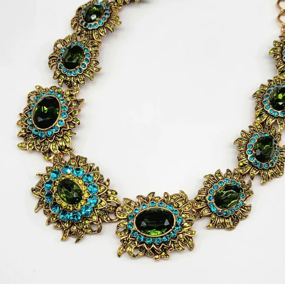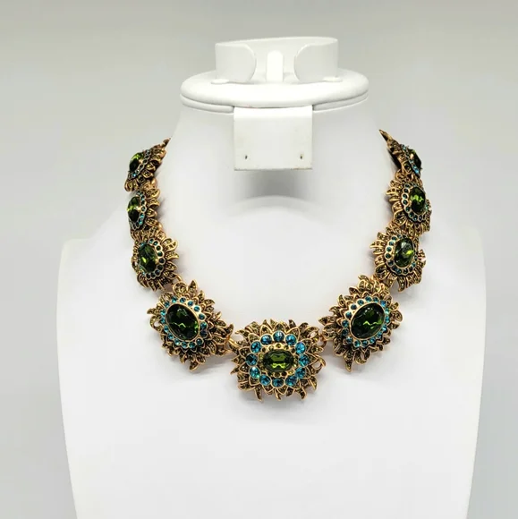 Thank you for visiting runwayreadyjewelry.com! (@runwayreadyjewelry on instagram + pinterest)Measurements: 16" with a 4" extender chain. Center flower is 1.5"T by 2"W.Metal: BrassFindings: Lobster ClawFinish: Polished, AntiquedWeight: 173gEXCELLENT CONDITIONFun fact: Did you know that there are over TWENTY THOUSAND different types of Chrysanthemums? Celebrate one of nature's most amazing flowers with this COMPLETELY SWAROVSKI ENCRUSTED flower piece from world famous fashion designer Oscar de la Renta! The flowers graduate in size from the back to the front, each with an olive-green tourmaline crystal center, a neon apatite halo (electric blue) and flowy peridot petals. The details on this piece are impeccable from the three-dimensional sculpting of the antique brass to the gorgeous weighty feel (173 grams!!!). What a perfect necklace for the spring and summer season! Designer signed 'Oscar de la Renta' and 'Made in the USA' with signature clover charm at the end of the extender chain.Mums the word!