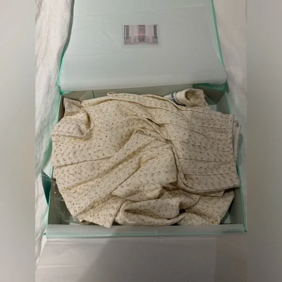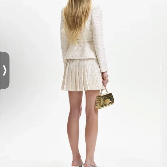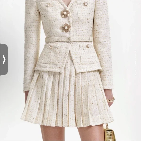 Brand new, with box and tags. Chic sophistication that requires close to no effort, this tailored dress is cut from cream metallic bouclé, which falls into a pleated mini skirt. Vintage-inspired bijoux buttons and two removable brooches bring further brilliance. A true investment piece, the detachable function offers the possibility of wearing top and bottom separately. Wear it to your next make-or-break meeting or cocktail party for the ultimate confidence boost. Check the Size Guide to find your perfect fit.