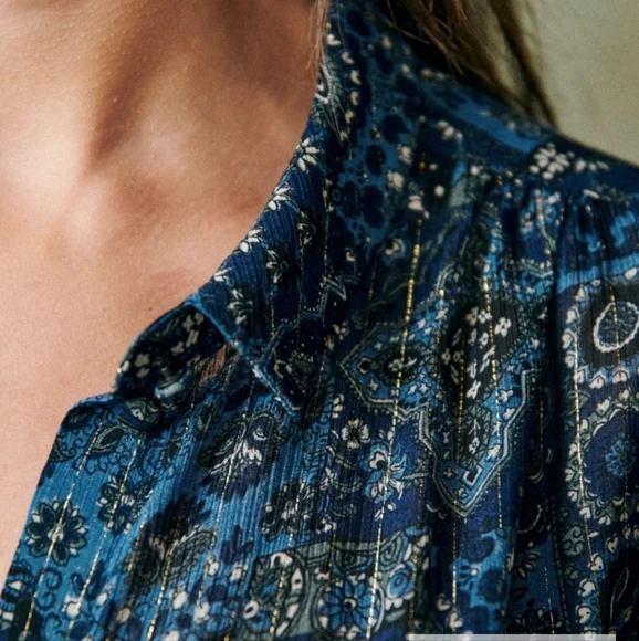 The SEZANE Tianna Shirt in Arizona Blue is a stylish and versatile addition to any woman's wardrobe. Made from a luxurious blend of silk and viscose, this long-sleeve button-up shirt features a relaxed fit, making it perfect for various occasions such as travel, casual outings, formal events, workwear, and business meetings. The collared neckline and colorful accents add a touch of sophistication, while the multicolor design keeps it fresh and stylish. Ideal for the winter, fall, and spring seasons, this shirt is a must-have for any fashion-forward woman.